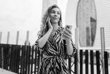 Smiling woman with a phone in her hands against the backdrop of the bustle of the city. A young woman blogs and chats on her phone outdoors. The concept of blogging, technology, tourism.