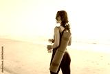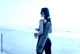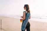 Rear view of young woman with yoga mat on shoulder enjoying sea view. Beautiful woman feeling freedom, going for workout outdoors. Freedom, relaxation and enjoyment concept.