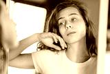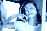 Close-up face of a young woman with rashes looking at the mirror in a cozy room. Beautiful woman with problem skin enjoying her natural beauty. Dermatology concept, beauty and naturalness.