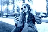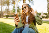Young woman wearing sunglasses and holding a phone and having fun in a sunny park. Beautiful tourist listening to music or podcast on wireless headphones outdoors. Walking, relaxing concept.