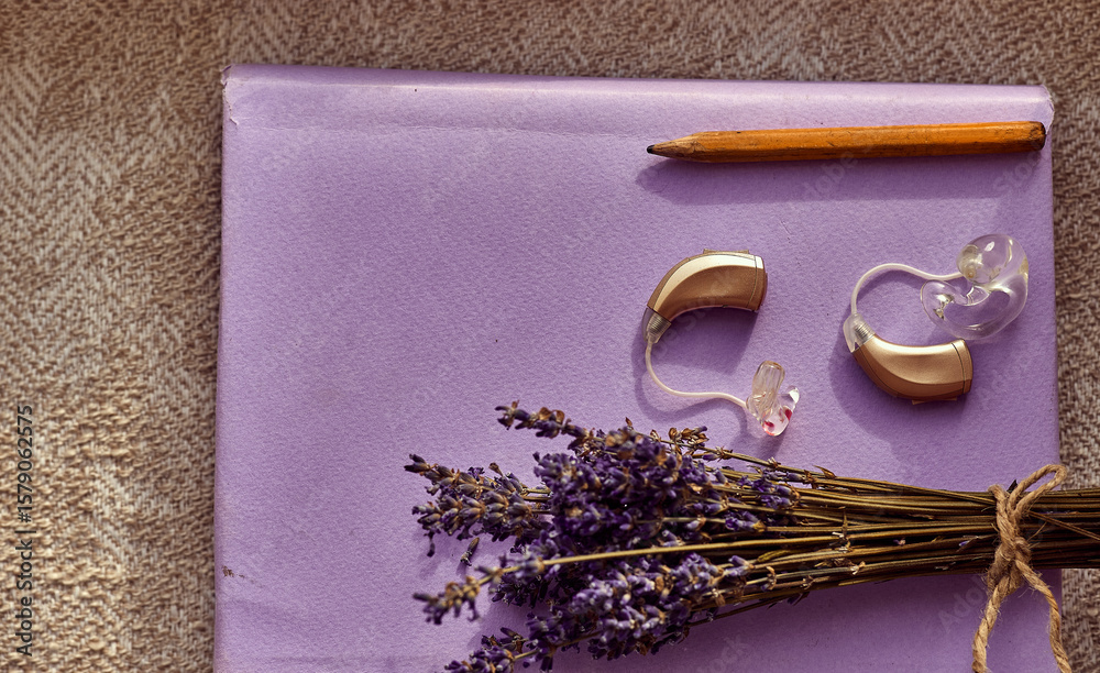 Hearing aids rest beside a lavender bouquet and a pencil on a soothing pastel surface, symbolizing care and comfort for hear