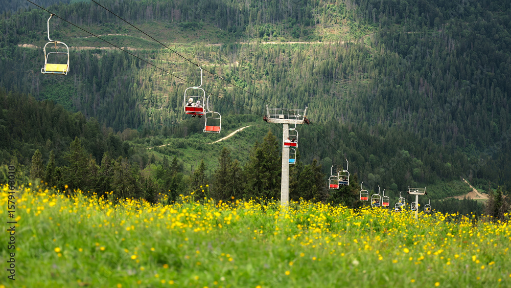 Colorful chairlift over wildflower meadow in mountains. A scenic mountain chairlift glides above a field of yellow wildflowers, surrounded by dense green forest and summer landscape.