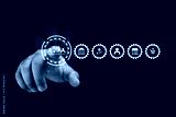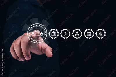 A person interacts with a futuristic digital interface focusing on B2B business solutions and related icons.