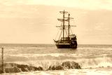 Seascape with a sailing ship stylized as a pirate. Wave in the foreground