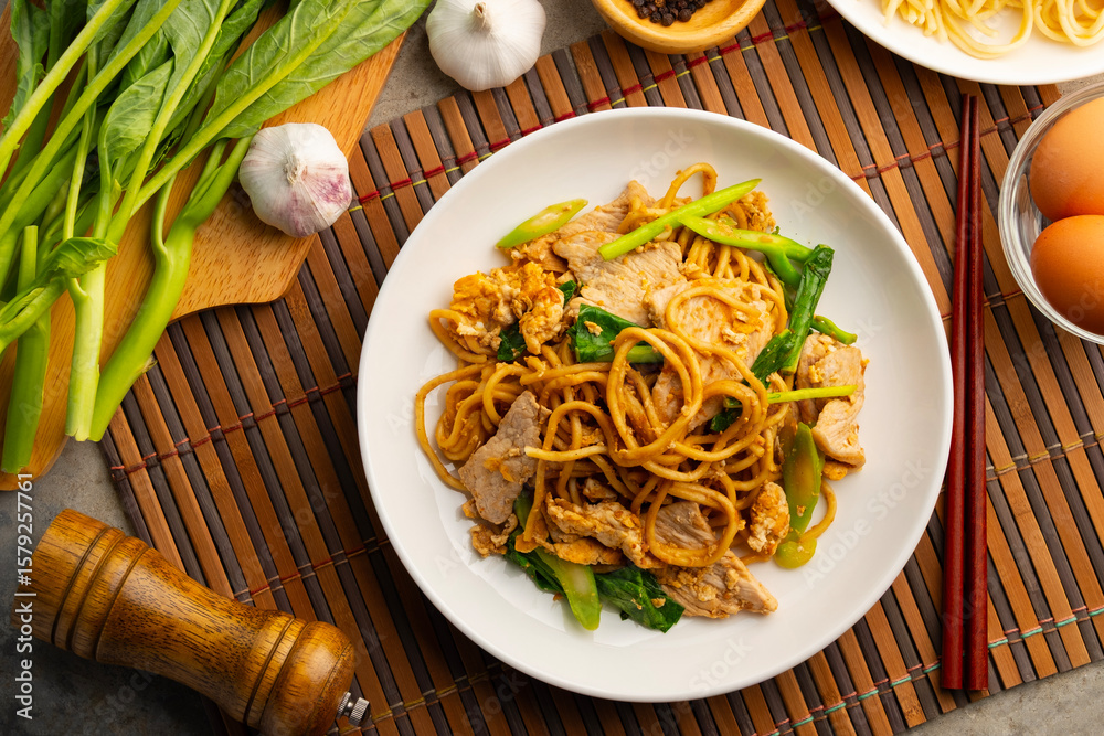 Stir fried yakisoba noodles with Sweet Black Sauce,stir fry Japanese style noodles with garlic sliced pork meat kale and chicken egg with soy sauce.Thai fusion food (Pad See Ew).Top view.