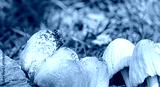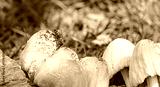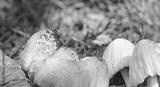 Close examination shows a bee perched on mushroom caps, highlighting intricate anatomical features and natural textures. The soft light enhances the detailed structure of both the bee and fungi