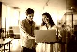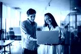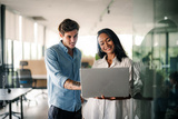 Two happy diverse multiethnic business team people working, talking in corporate office