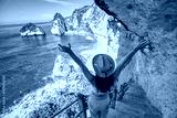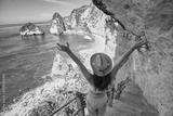 Traveler woman enjoying of amazing landscape of scenic way to Diamond beach during vacation to Nusa Penida Island in Indonesia, travel to touristic beautiful destinations
