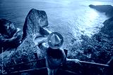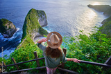 Woman traveler stands on steps of stairs and enjoying landscape of scenic Kelingking beach during vacation to Nusa Penida Island in Indonesia, travel to touristic beautiful destination