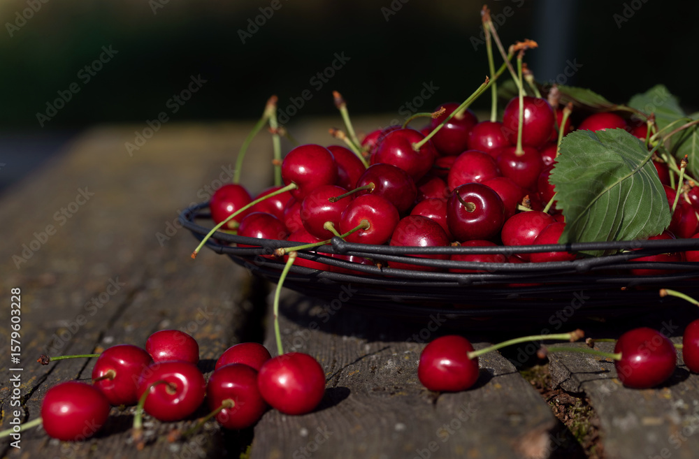 Freshly harvested cherries lie in a metal basket. The basket stands on an old wooden table. Some cherries are lying next to the basket.