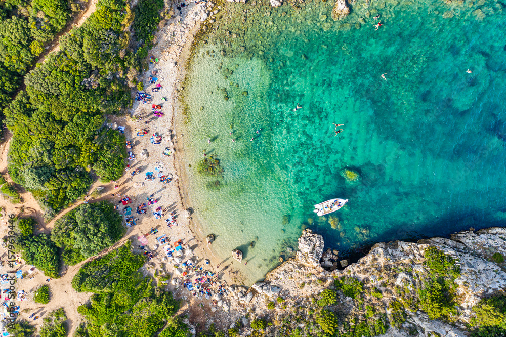 Corfu Island iconic image. Aerial drone view of Porto Timoni beach in Corfu. Ionian sea, Greece.