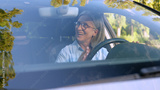 Laughing cheerful Caucasian elderly business woman car taxi driver auto owner mature businesswoman senior female inside automobile chatting mobile phone conversation smartphone call talking connection