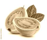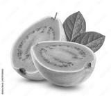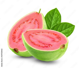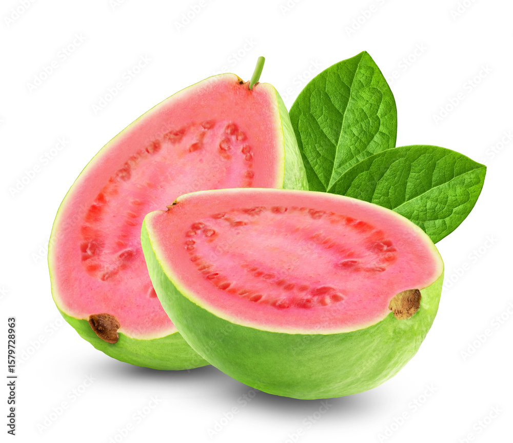 Two halves of guava with leaves isolated on transparent background.