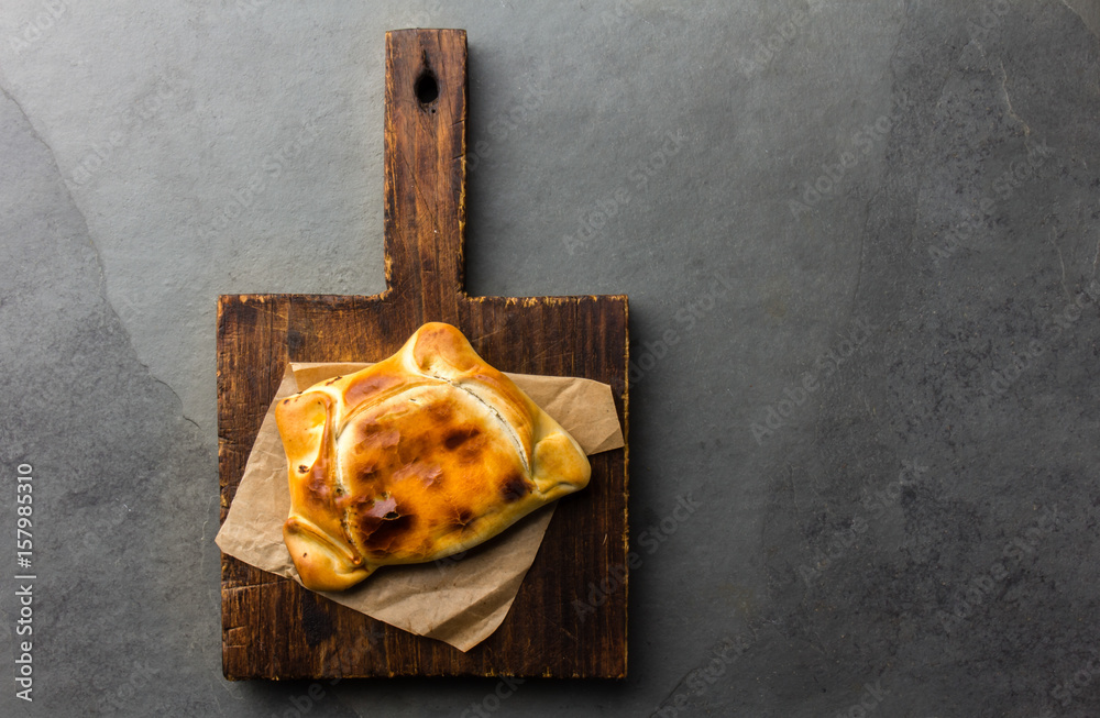 Chilean baked empanada de pino with meat, olives, onion and eggs. Copy space