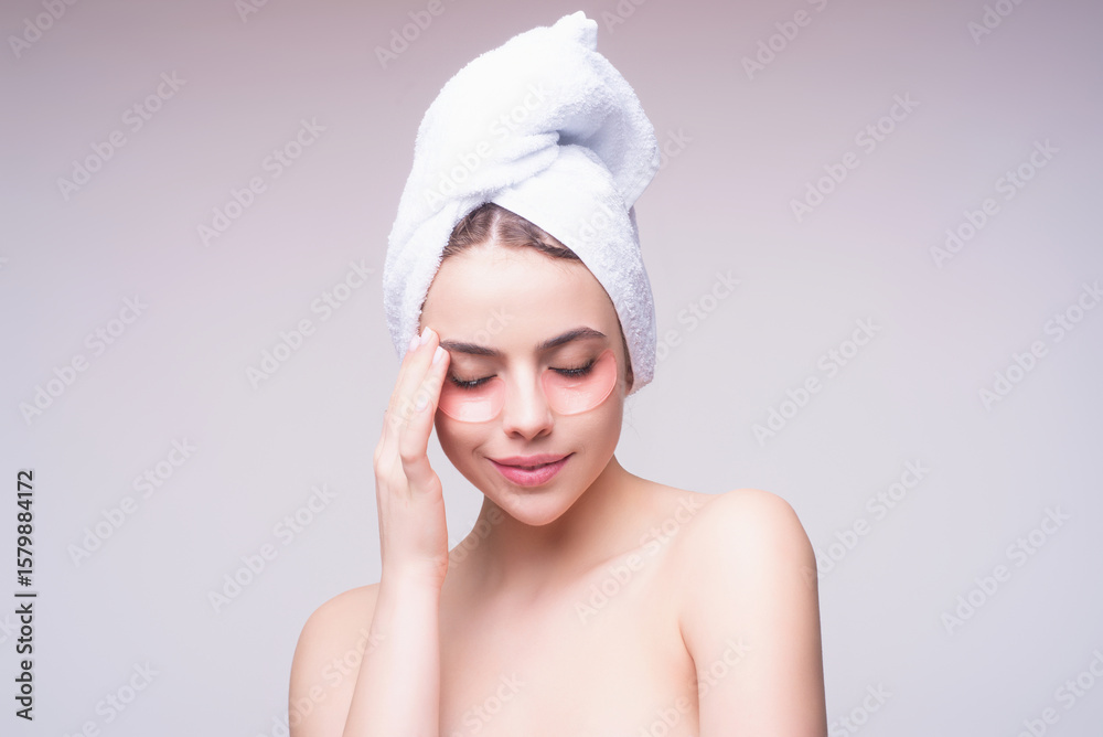 Collagen hydrogel eye patches, silicone patches. Skin with moisturizing patches under eyes. Spa care, cosmetology. Young woman using patches under eyes.