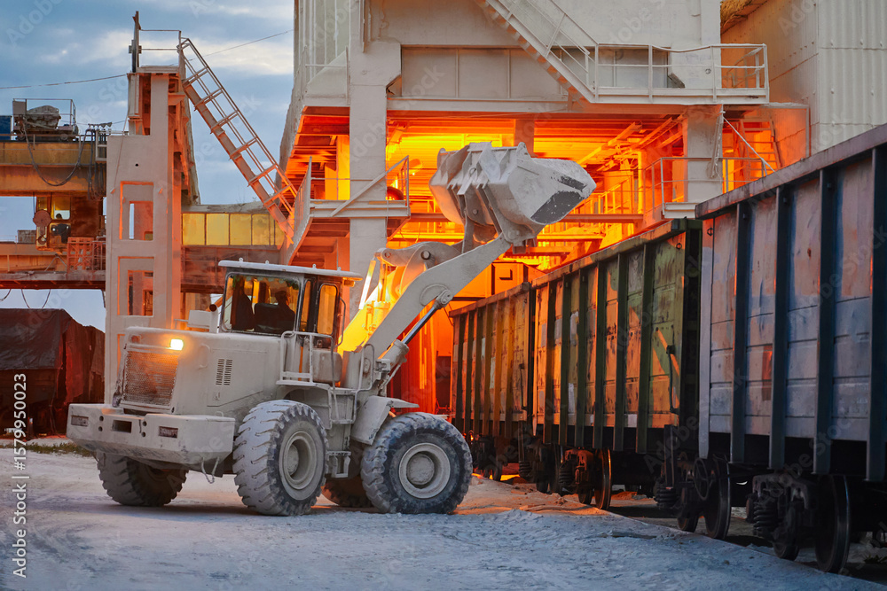 Wheel loader loads limestone into freight gondola cars