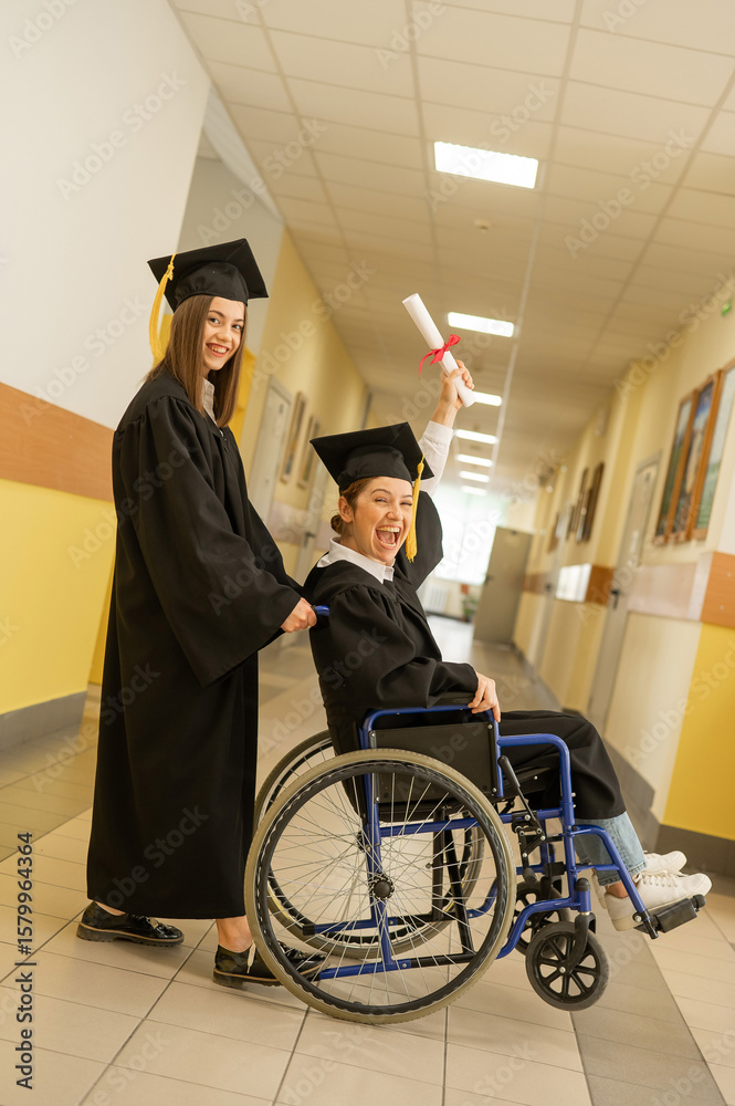 Happy young woman and woman in wheelchair in graduate gown with diploma in hands. Inclusive education.