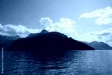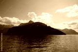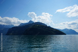 Panoramic view of Lake Lucerne (Vierwaldstättersee) with deep blue waters, surrounded by dark green forested slopes and distant alpine mountains under a bright blue sky with scattered clouds.