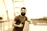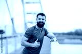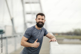 Portrait of smiling sportsman standing on a bridge during a break and giving thumbs up at the camera.
