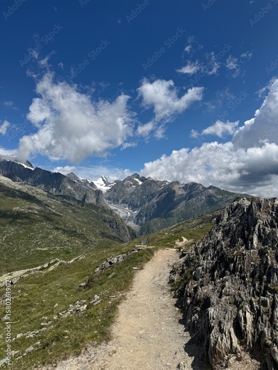 Sunny alpine hiking trail at Fiescheralp in Valais, Switzerland, with rocky foreground, green alpine meadows, and distant snow-capped peaks under a deep blue sky with scattered clouds.