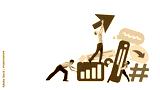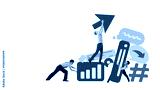 Pop-art collage with group of people lifting arrow on media symbols. Concept of teamwork, digital promotion, community engagement, social media performance growth.