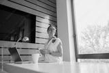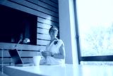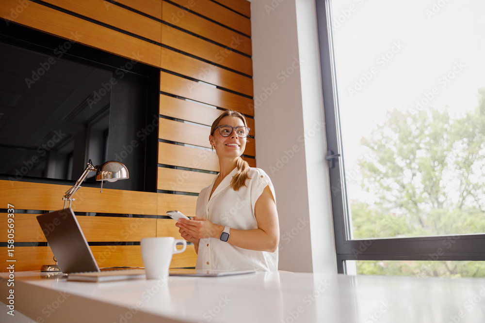 A dedicated and focused professional woman sitting in a sleek office environment, thoughtfully engaging with her laptop