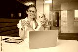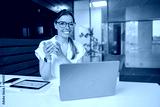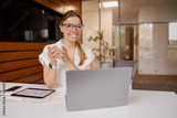 A cheerful young woman enthusiastically engages with her laptop while situated in a stylish office environment