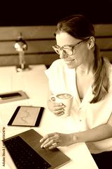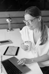 A professional woman engages with technology in a stylish workspace, sipping coffee and focusing on her tasks.