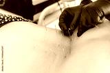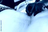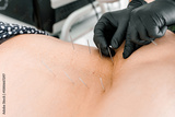 Doctor in clinic wears gloves, inserts acupuncture needles in patient lower back. Back pain therapy. Spine treatment. Orthopedic recovery. Manual procedure. Rehabilitation, muscle health,nerve healing
