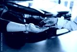 Detailed view of hands of customer that is taking keys for new purchased car