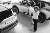 Far top view. Pretty woman is in the car retail shop