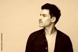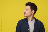 A young man with dark hair and a mustache looks thoughtfully to the side, standing against a bright yellow backdrop. He is wearing a navy blue shirt over a gray t-shirt