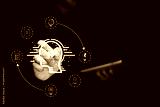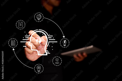A person using a tablet interacts with a digital interface showing a lightbulb inside a head, surrounded by icons representing ideas, documents, and innovation.