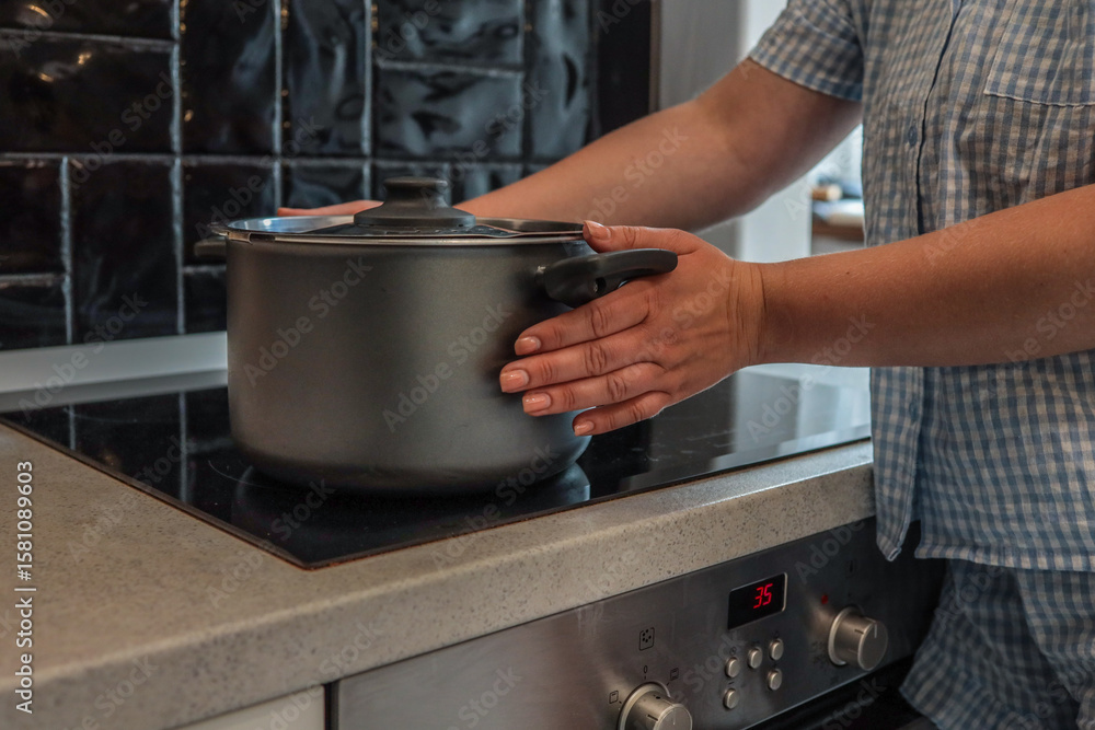 Person placing a metal pot on an induction stove in a modern kitchen with black tile backsplash and stainless steel oven