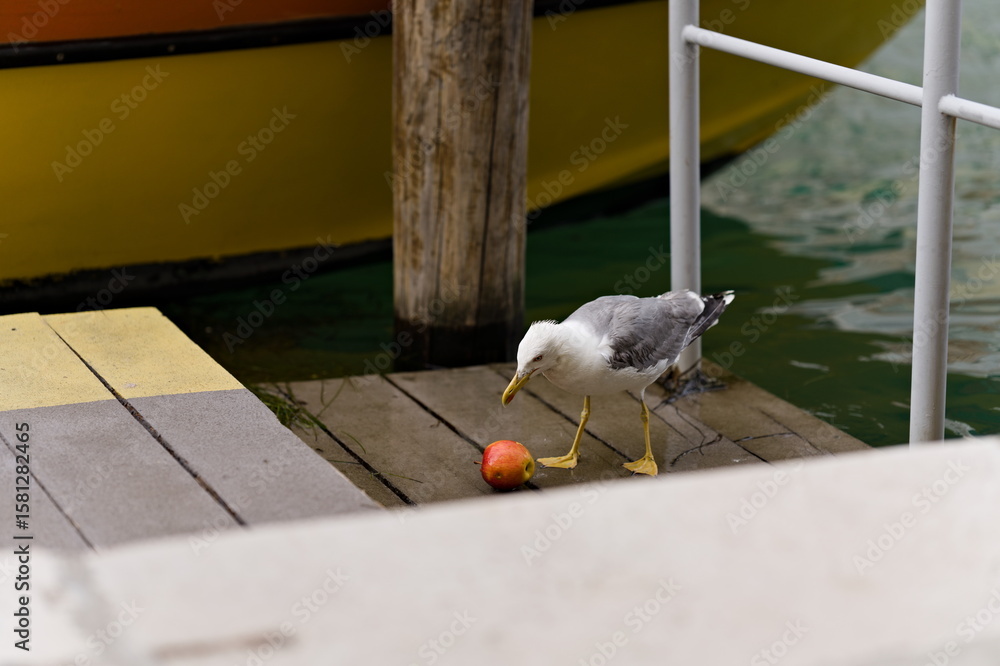Mewa z jabłkiem na pomoście