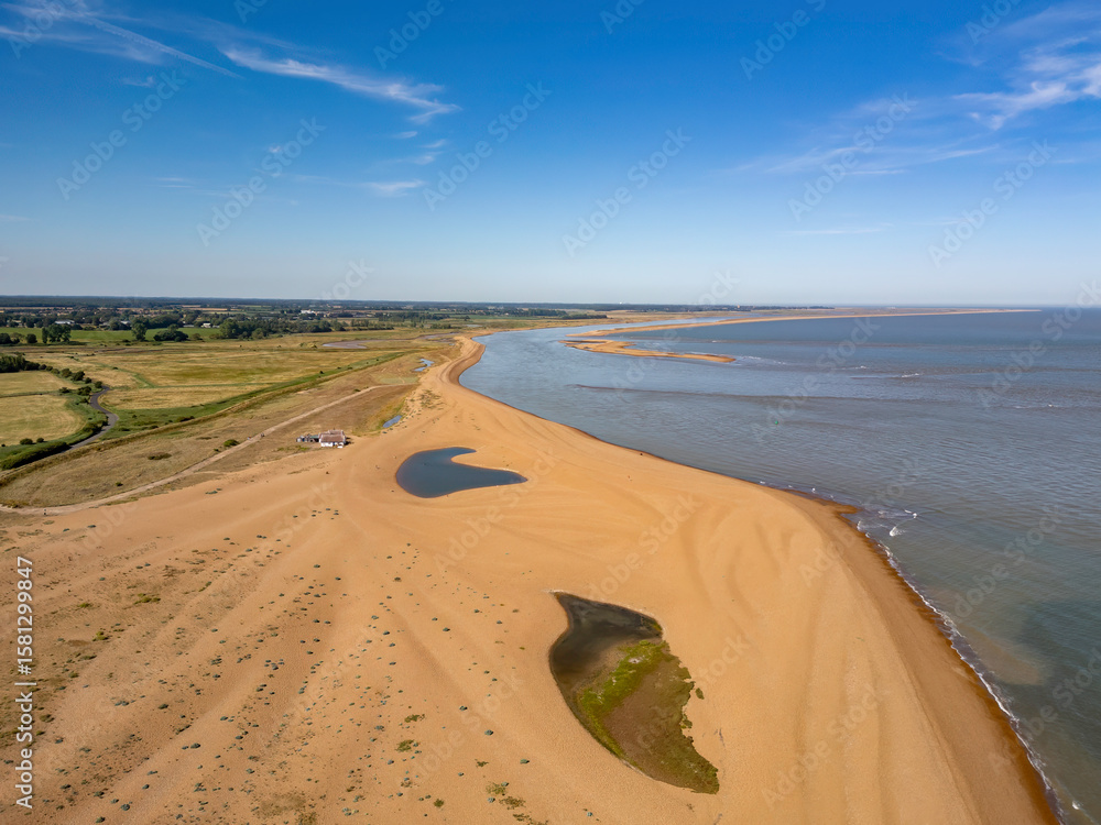 An aerial view on a summers day of Shingle Street in Suffolk, UK