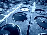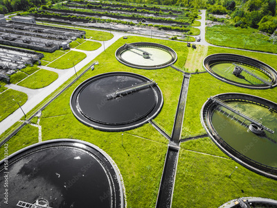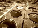 Sewage farm. Static aerial photo looking down onto the clarifying tanks and green grass. Geometric background texture.