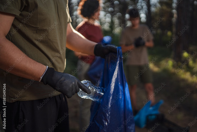 close up on unknown man hands hold plastic bottle and bag