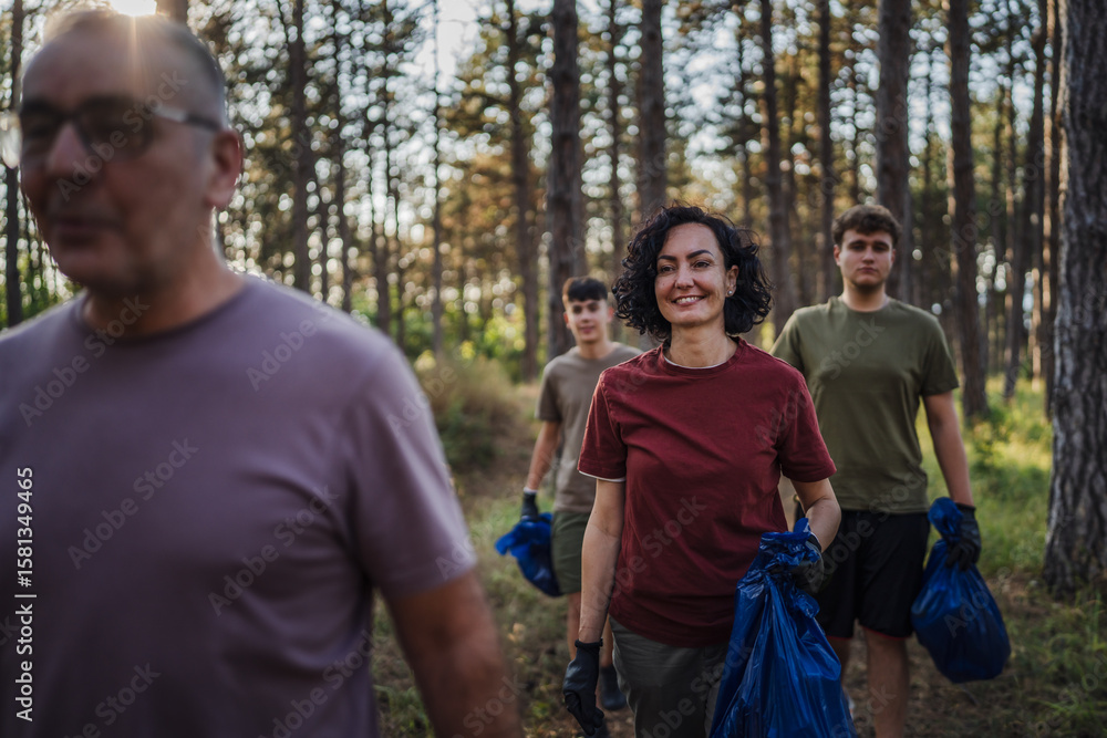 family of volunteers pick up waste garbage and walk through from forest