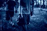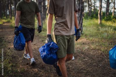 unknown volunteers pick up waste garbage and walk through from forest