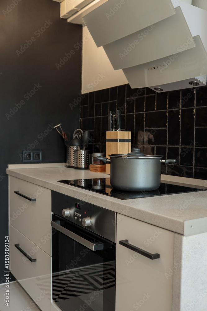 Modern kitchen with black induction stove, pot on the cooktop, minimalist drawers, white angular range hood, and a black tile backsplash creating a stylish, contemporary look