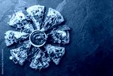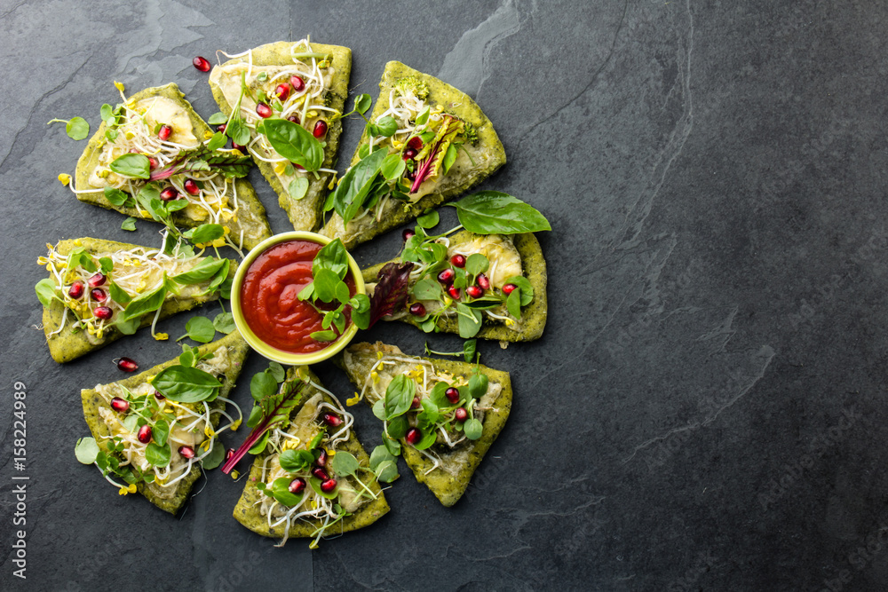 Flower made from green spinach dough pizza with vegetables. Copy space, top view