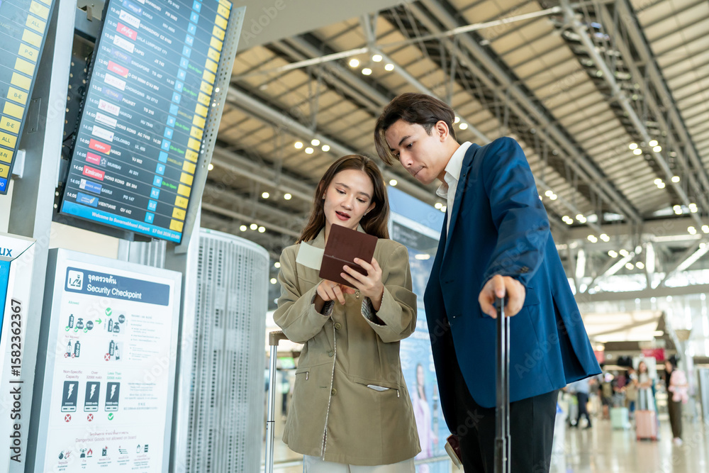 Asian businesswoman passenger standing outdoors of airport terminal.