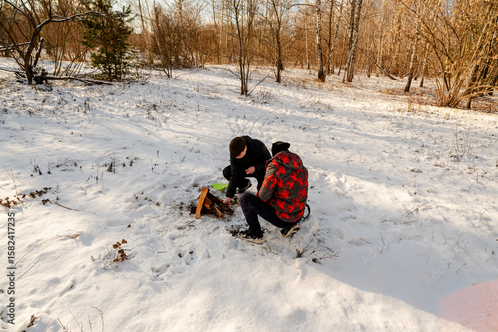 Two people prepare a campfire in a sunny winter forest, surrounded by snow. Friends enjoying nature and outdoor activity in cold weather.