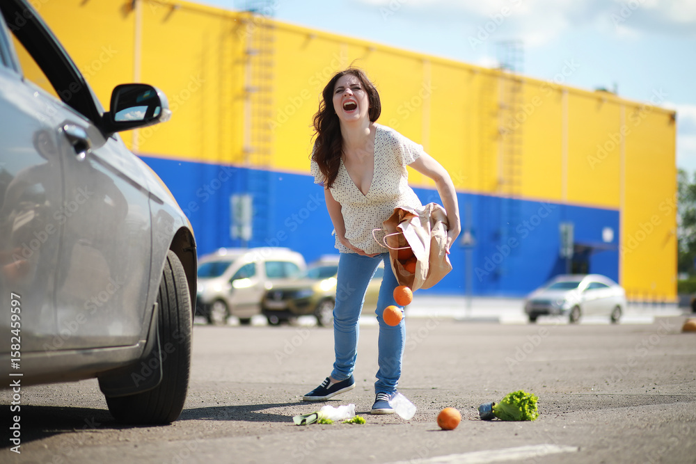 Pregnant woman with shopping comes from the store