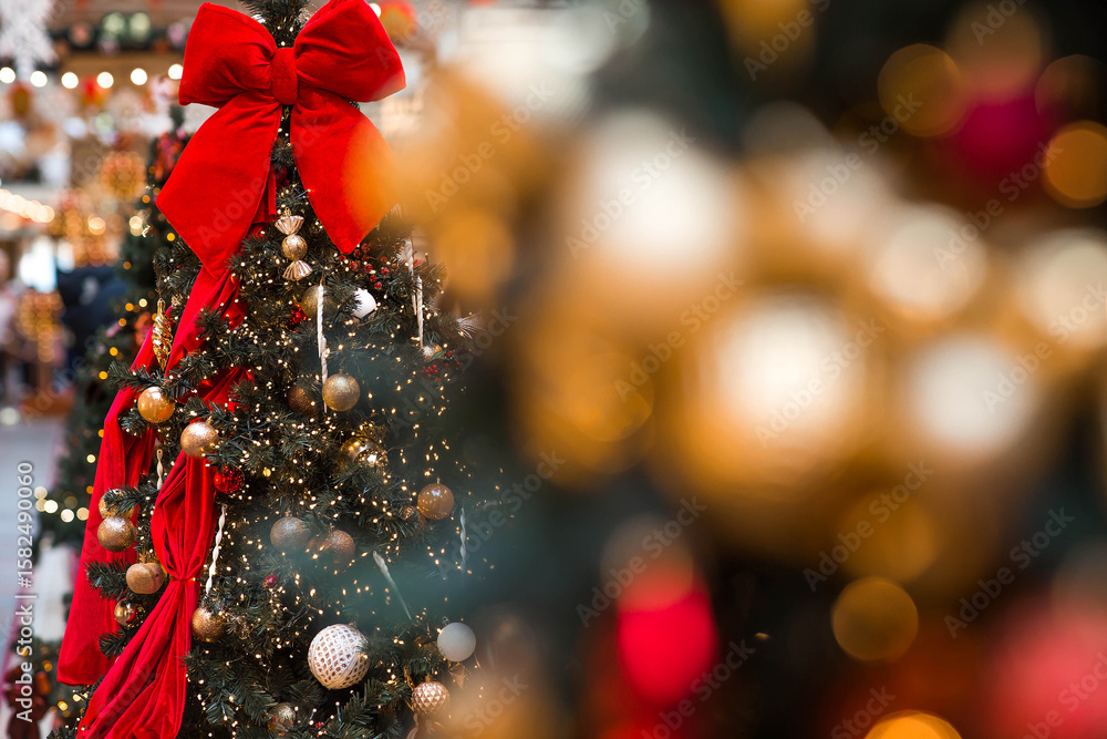Holiday toys in red and gold colors on the New Year's tree. New Year's card 2026. Atmospheric Christmas background. Concept of preparing for the New Year.