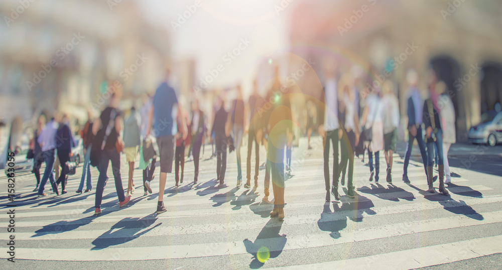 Busy Pedestrian Crossing over zebra on sunny day in the city