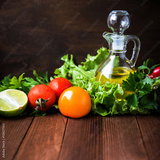Fresh tomatoes, lime, sweet pepper, lettuce, parsley and olive oil on dark wood background. Healthy food. Vegetables and greens. Salad ingredients.