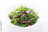 Fresh salad with mixed greens (arugula, mesclun, mache) on white wooden background close up. Healthy food.