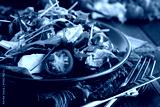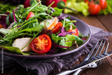 Fresh salad with chicken, tomatoes and mixed greens (arugula, mesclun, mache) on wooden background close up. Healthy food.